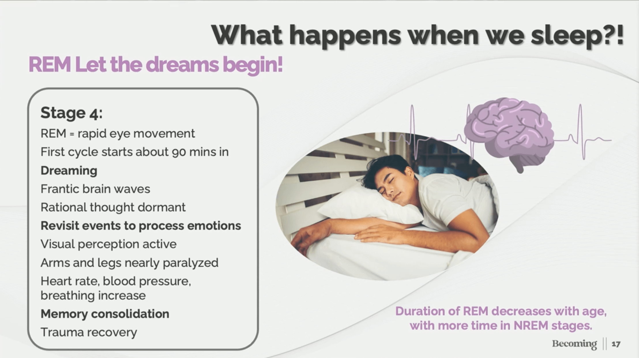 During REM, the body’s overnight therapy begins. Dr. Matthew Walker of UC Berkeley calls it “the time when we sleep to remember — and sleep to forget.”