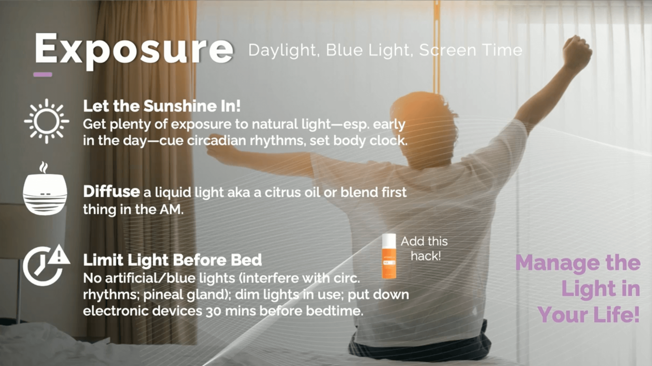 Morning sunlight resets your circadian rhythm. At night, reduce screen time and blue light exposure — it tells your pineal gland it’s still daytime.