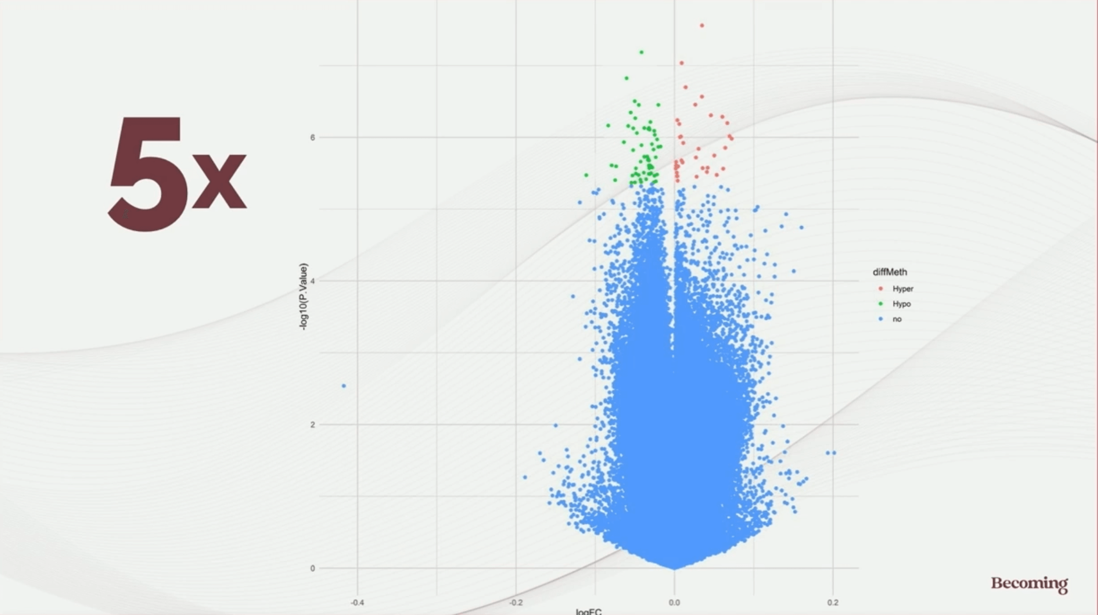 The results were displayed in what’s called a volcano plot, where each dot represents a gene.