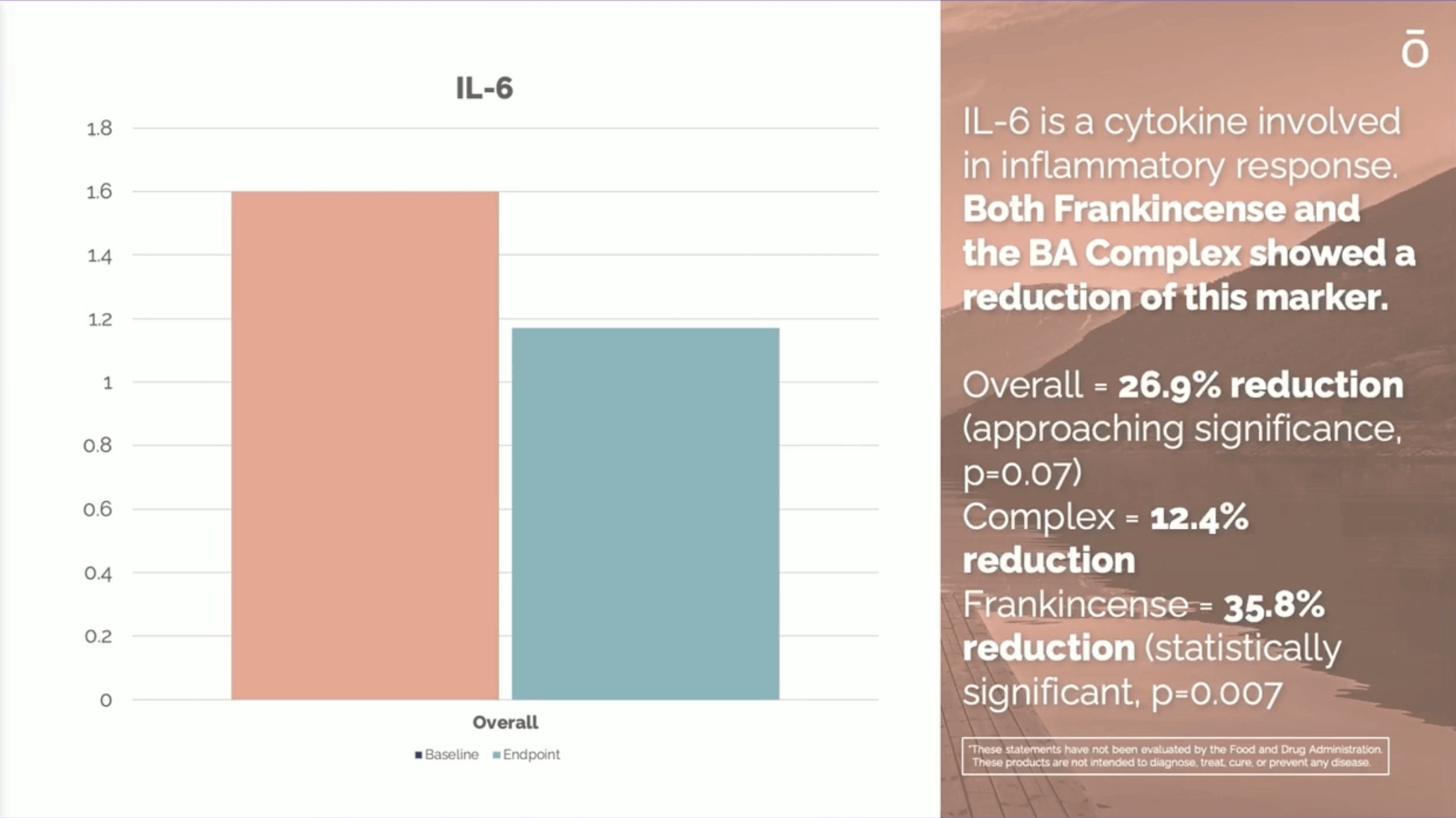 Interleukin-6 (IL-6), another key inflammatory messenger, dropped even more dramatically, with statistical significance (p = 0.038).