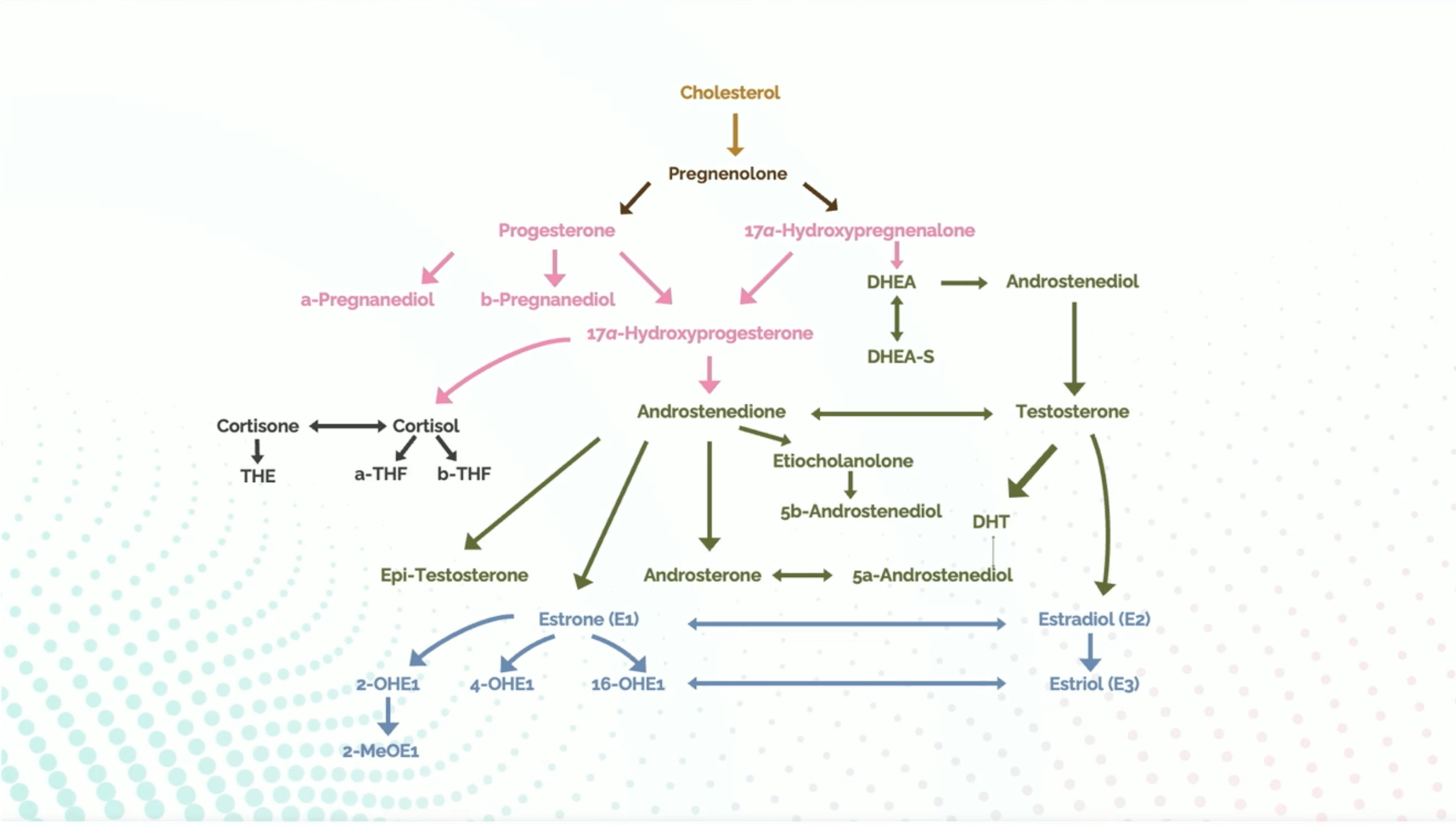 Let’s zoom into the left half of the chart. Everything begins with cholesterol, which converts into pregnenolone—your body’s master raw material or “currency” for hormone production.